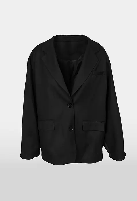 Това черно сако-бомбър е със свободна кройка и е без принт, което го прави лесно за комбиниране. Има заострена яка и дълги ръкави, а закопчаването е с копчета. Разполага с два удобни джоба. Изработено е от смес с 45% памук, 45% полиестер и 10% еластан, което осигурява комфорт и издръжливост.