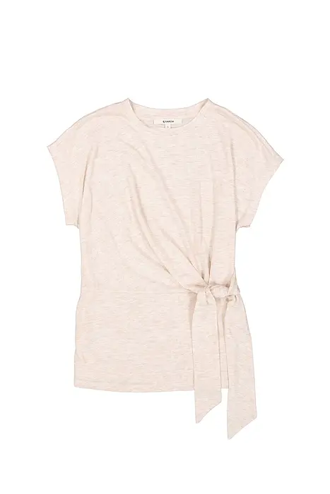 Стилна тениска с панделка и фин блясък. Тази тениска е с кръгло деколте, къси ръкави и стандартна кройка. Артикулът е изработен от 64% рециклиран полиестер, 35% вискоза и 1% метална прежда, което осигурява луксозен външен вид и удобно прилягане.