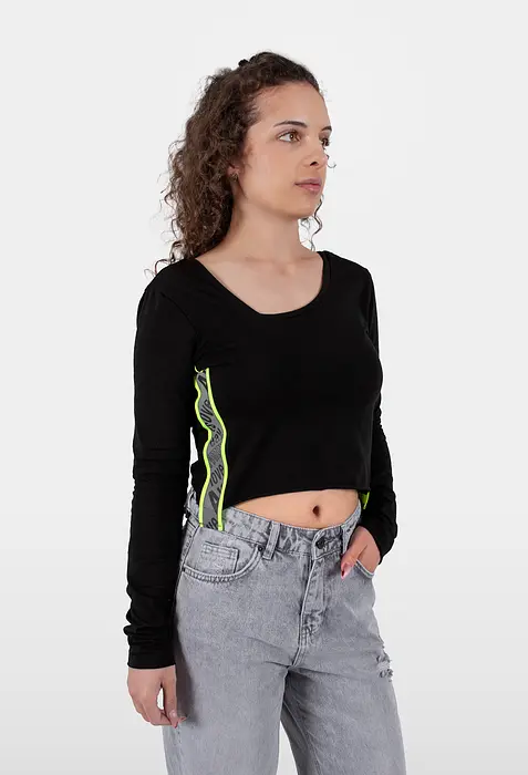 Тази къса черна блуза съчетава елегантна кройка по тялото със спортен акцент - ефектна неонова лента отстрани. V-образното деколте и дългите ръкави подчертават стила. Изработена от мека и еластична смес от памук и еластан, тя осигурява комфорт и прилепналост.