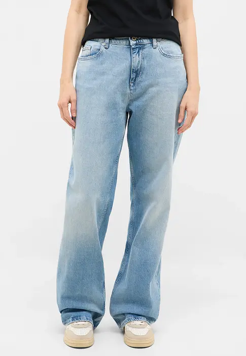 Тези сини дънки се отличават с модерен широк крачол и ниска талия, които придават небрежен и актуален вид. Изработени са от смес от памук, лиоцел и еластан (73% памук, 26% лиоцел, 1% еластан), което осигурява мекота, еластичност и комфорт. Дънките са с дълга дължина и разполагат с пет класически джоба. Закопчаването е стандартно с цип и копче.Те са отличен избор за създаване на обемна и стилна ежедневна визия.