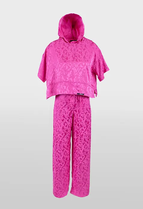 Този ефектен цикламен комплект включва панталон и блуза, изработени от 100% полиестер с луксозен сатенен блясък. Проектиран в спортно-елегантен стил, той предлага свободна кройка за максимален комфорт и модерна визия. Блузата е с къс ръкав, а панталонът е с висока талия, което подчертава силуета. Този комплект е идеален за събития, на които искате да изглеждате стилно, удобно и запомнящо се.