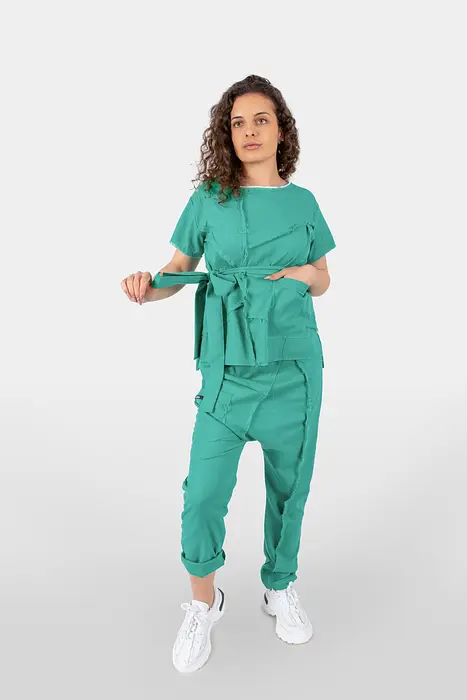 Този зелен ленен комплект включва свободна блуза с къс ръкав и удобен панталон с висока талия. Съчетавайки спортно-елегантен стил и изработен от лека и дишаща смес от 80% лен и 20% полиестер, комплектът е идеален за топлите дни, осигурявайки комфорт и стил.