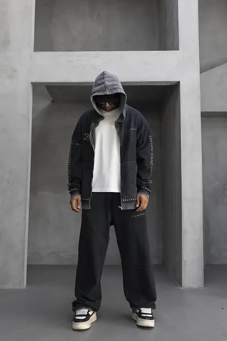 Този черен мъжки комплект, състоящ се от панталон и суитшърт, е изработен изцяло от 100% памук. Висококачествената естествена материя осигурява мекота и комфорт през целия ден, а спортно-елегантният стил превръща комплекта в универсален избор за градска среда. Отличава се с модерен текстов принт, който придава на визията индивидуален и съвременен характер. Дизайнът залага на свободна кройка, гарантираща пълна свобода на движение. Горната част е оборудвана с удобна качулка, дълги ръкави и надеждно закопчаване с цип, което го прави лесен за обличане. Панталонът е проектиран с нормална талия и включва два практични джоба, допълващи функционалността на модела.