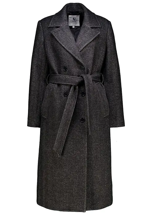 Дълго палто от елегантен плат с рибена кост. Това палто е с двойно закопчаване с копчета, колан на талията, дълги ръкави, яка и свободна кройка, което го прави идеално както за ежедневни, така и за официални поводи. Външният слой на това палто е изработен от 60% полиестер и 40% вълна.