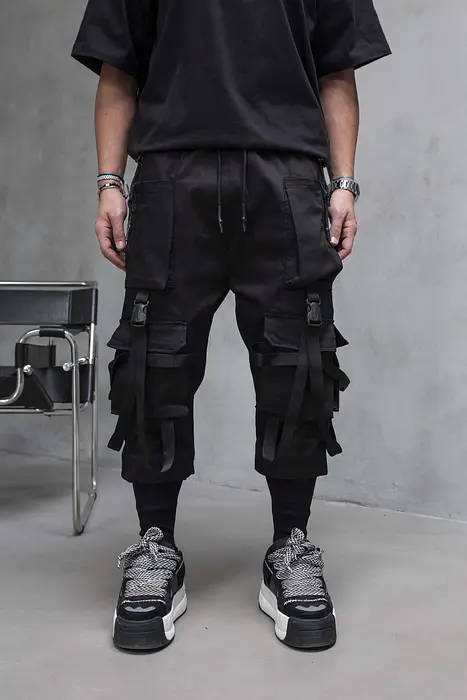 Черните тактически къси панталони с презрамки внасят смел практични нотки във вашата улична мода. Проектирани с множество джобове, удължени тактически презрамки и структуриран силует, тези шорти предлагат едновременно функционалност и открояващ се стил.