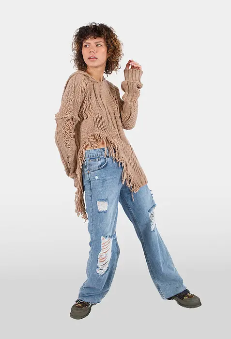 Този дизайнерски пуловер в кафяв цвят е изработен от топла и мека смес от 70% вълна и 30% акрил, което осигурява комфорт и топлина през студените дни. Пуловерът е със свободна кройка и дълги ръкави, което го прави идеален за удобно и небрежно носене. Дизайнът е без закопчаване и залага на чистотата на линиите и висококачествената вълнена материя.