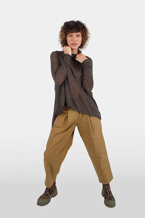 Този кафяв пуловер тип поло е идеален за студените дни, изработен от топла смес от 70% вълна и 30% акрил. Това съчетание гарантира мекота, топлина и приятен допир. Пуловерът е със свободна кройка и се отличава с асиметричен дизайн, който придава модерен и нетрадиционен вид. Той е с дълъг ръкав и без закопчаване, което го прави удобен и лесен за носене.