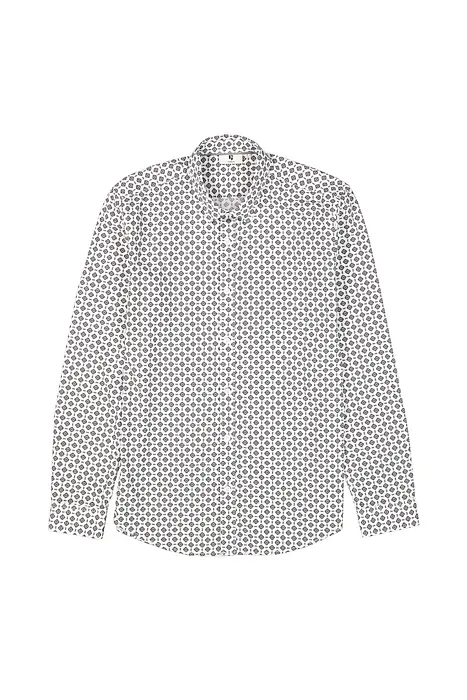 Стилна риза с цялостен принт. Тази риза е с класическа яка, дълги ръкави и закопчаване с копчета, със стандартна кройка за оптимален комфорт. Този артикул е изработен от 100% памук, което осигурява дишащо и меко носене.