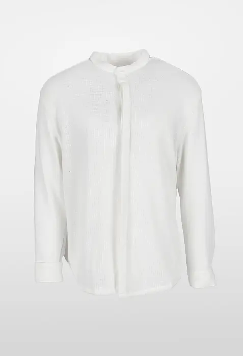 Тази бяла риза е изработена от меко трико, съчетаващо полиестер, вискоза и ликра за комфорт и еластичност. Със спортно-елегантен стил и стандартна кройка, тя е подходяща за различни поводи. Ниската яка и дългите ръкави завършват елегантния вид. Закопчаването е с копчета.