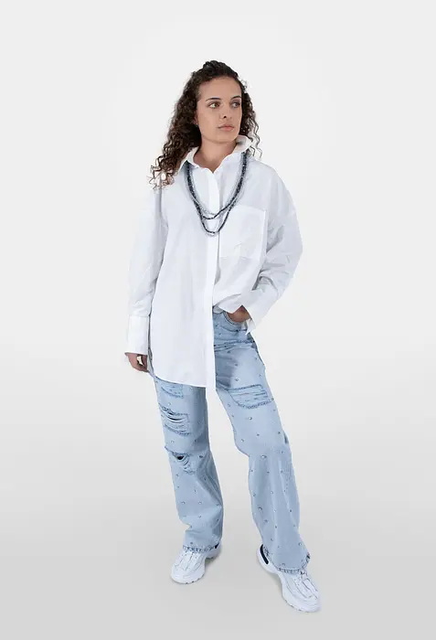 Тази дълга бяла риза съчетава спортно-елегантен стил със свободна кройка, осигуряваща комфорт и лекота на движение. Дългите ръкави и дължината ѝ я правят универсална за различни поводи. Изработена е от мека и приятна на допир смес от 60% памук и 40% полиестер.