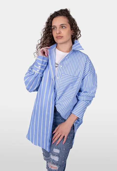 Тази синя раирана риза съчетава спортно-елегантен стил със свободна кройка, осигуряваща комфорт през целия ден. Острата яка придава изискан вид, а дългите ръкави я правят подходяща за различни сезони. Закопчаването е с копчета. Изработена е от мека и приятна на допир смес от 60% памук и 40% полиестер.
