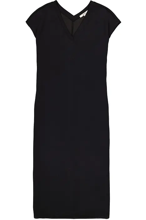 Елегантна рокля миди с V-образно деколте. Роклята е с къси ръкави, свободна кройка и пада до прасците. Артикулът е изработен от 51% модал, 44% полиестер и 5% еластан, осигурявайки удобно и гладко прилягане.