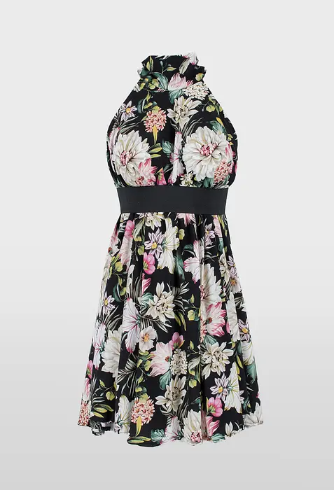 Тази черна рокля съчетава спортно-елегантен стил със свободна кройка, осигуряваща комфорт и лекота през целия ден. Изработена е от 100% памук, което я прави мека, дишаща и приятна на допир. Акцентът е върху флоралния принт, който придава свежест и женственост на модела. С дизайн без ръкави и дължина над коляното, роклята е идеален избор за топлите месеци, предлагайки непринуден и стилен вид.