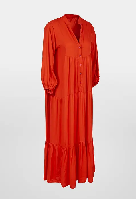 Тази дълга оранжева рокля съчетава спортно-елегантен стил с комфортна свободна кройка. Изработена от мека и струяща вискоза с добавен ликра за еластичност, тя е изключително приятна за носене. Наситеният оранжев цвят привлича вниманието и добавя свеж акцент към визията. Дългите ръкави и дължината до пода придават елегантен силует, идеален за различни поводи.