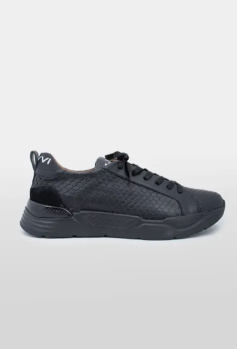 Тези черни кецове съчетават спортно-елегантен стил с отличителен дизайн, благодарение на естествената кожа с ефект "люспа", придаваща им уникална текстура и визия. Закопчаването е с връзки, осигуряващи стабилност и добро прилягане. Вътрешната част е изцяло от естествена кожа за максимален комфорт и дишаемост. Ходилото е изработено от 100% олекотена гума (полиуретан), което гарантира лекота и удобство при всяка стъпка.