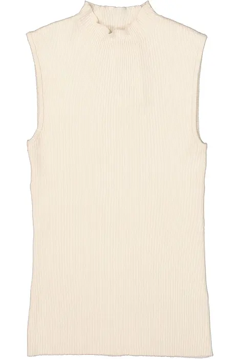 Топ с ребрена кройка. Този топ без ръкави е с яка с изправена талия и вталена кройка. Дрехата е изработена от 50% вискоза, 28% полиестер и 22% полиамид, което осигурява удобно и дишащо прилягане.