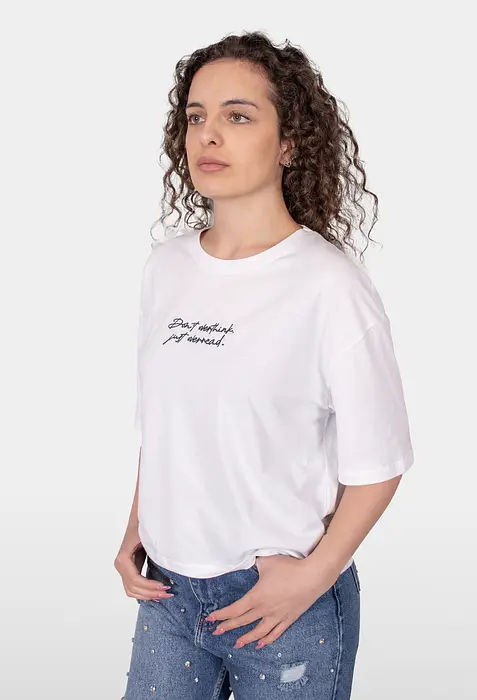 Бяла тениска с черен надпис, Принт-Текст, Цвят-Бял, Материал-Памук,Кройка-Свободна, Стил -Спорно -елегантен,Деколте-Овално-деколте,Дължина ръкав-Къс ръкав, Състав-100% памук