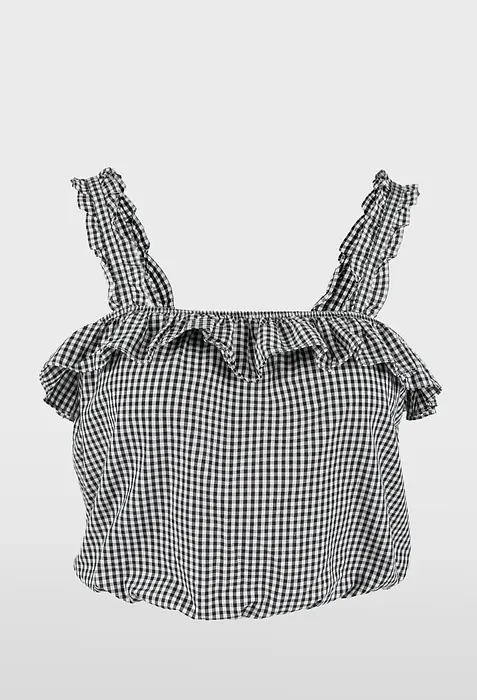 Този бял топ е класически и стилен избор, отличаващ се с елегантен принт "пепит". Изработен е от 100% памук, което гарантира мекота, дишаемост и комфорт през целия ден. Със стандартна кройка и дизайн без ръкави, той е идеален за топлите месеци и лесно се комбинира с различни облекла за непринудена или по-официална визия.