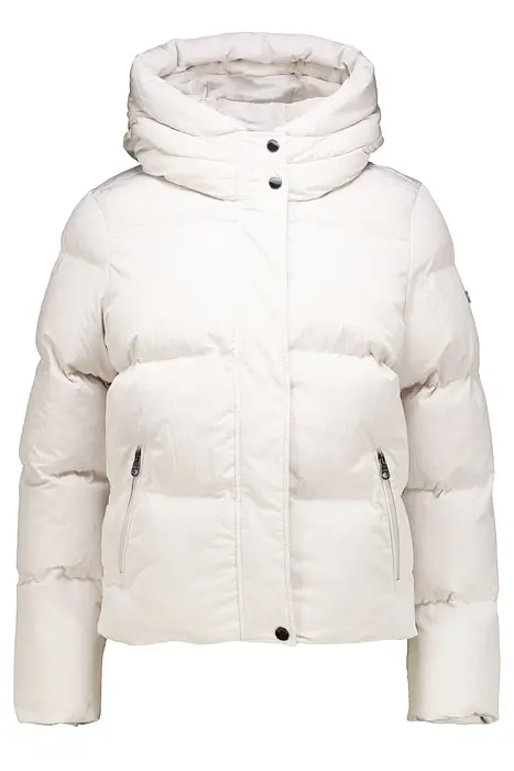 Стилно подплатено пухено яке с ниска качулка и висока вътрешна яка. Това подплатено яке е изработено от водоотблъскващ материал и е подплатено с мек синтетичен пух за комфорт и топлина. Якето е с дълги ръкави, закопчаване с цип с допълнителен ветроустойчив капак и тик-так закопчалки, джобове с цип за ръцете и свободна кройка. Външният слой на якето е изработен от 57% полиамид и 43% полиестер.