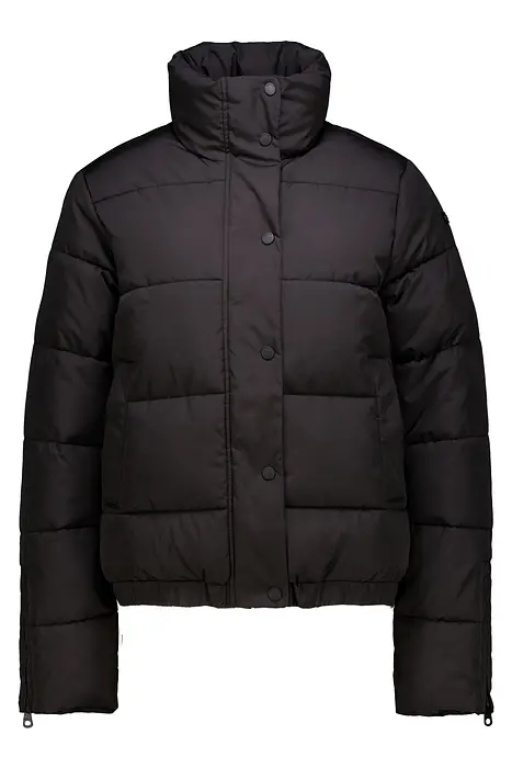 Късо пухено яке с удобна, модерна кройка. Това подплатено яке е изработено от водоотблъскващ материал и е подплатено с мек изкуствен пух за комфорт и топлина. То разполага и с щедра яка, дълги ръкави с цип, закопчаване с цип с допълнителен ветроустойчив плат с копчета и ластик на подгъва за допълнителна изолация. Външният слой на това яке е изработен от 100% полиестер.