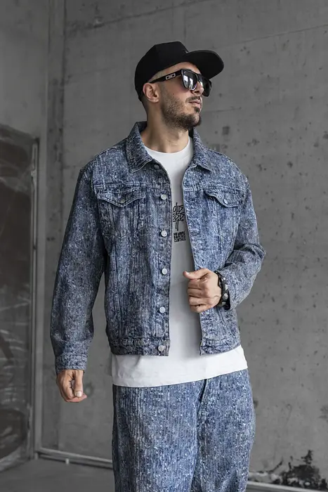 Това синьо винтидж дънково яке с пръскан ефект добавя артистична текстура към класическия стрийтуеър стил. Проектирано с свободна кройка, то се отличава с уникална петниста обработка, която придава на денима смел, леко износен характер. Финният мраморен ефект подсилва визуалната дълбочина и създава отличителна визия, без да изглежда прекалено състарено. Предното закопчаване с копчета, двата нагръдни джоба и структурираните шевове осигуряват практичност за ежедневието, като същевременно запазват ретро и модерно излъчване. Перфектно за комбиниране с тениски, суичъри и пуловери през всички сезони.